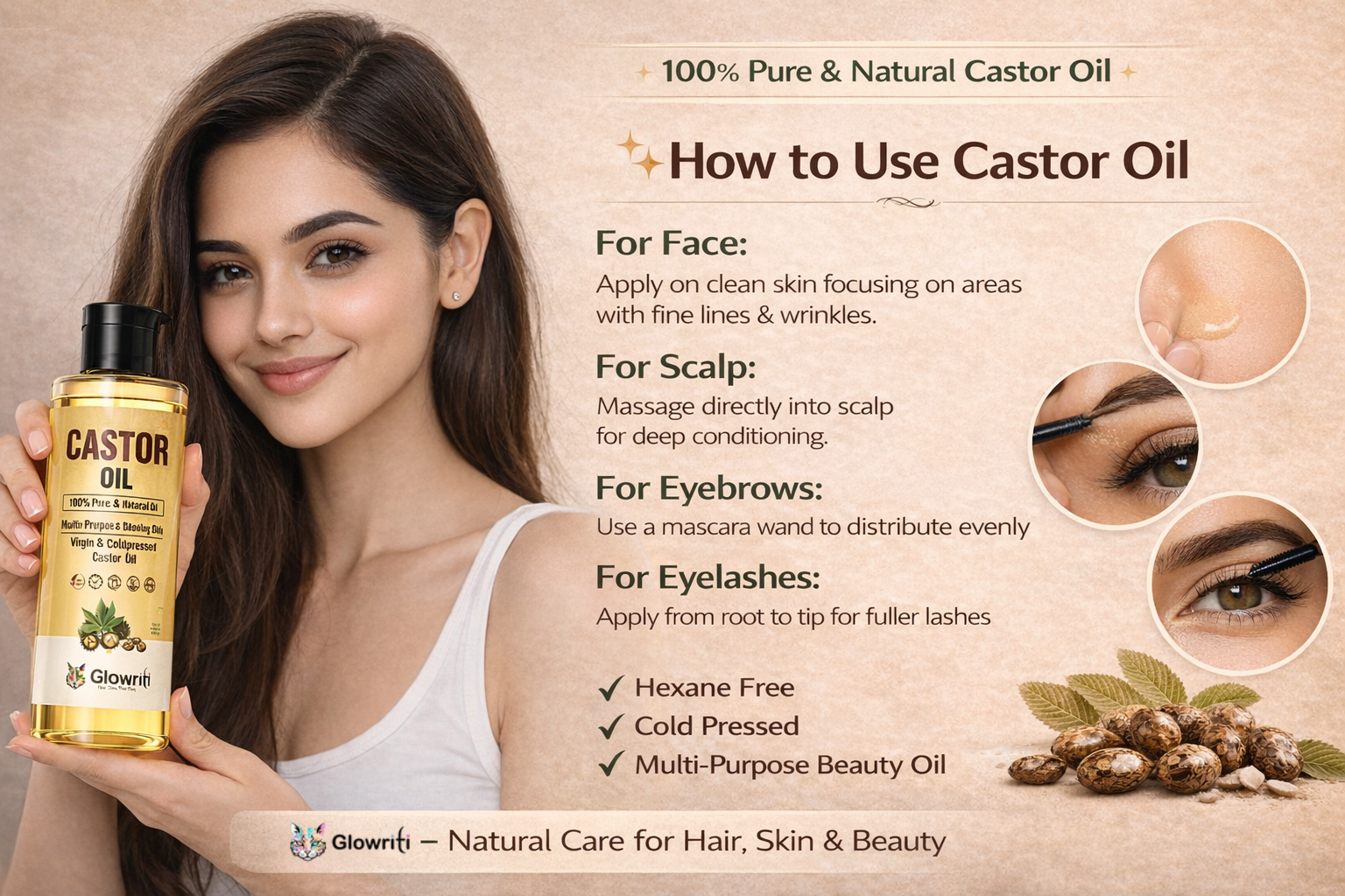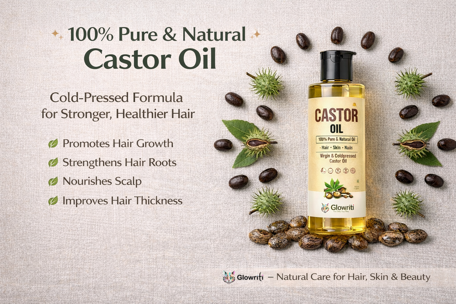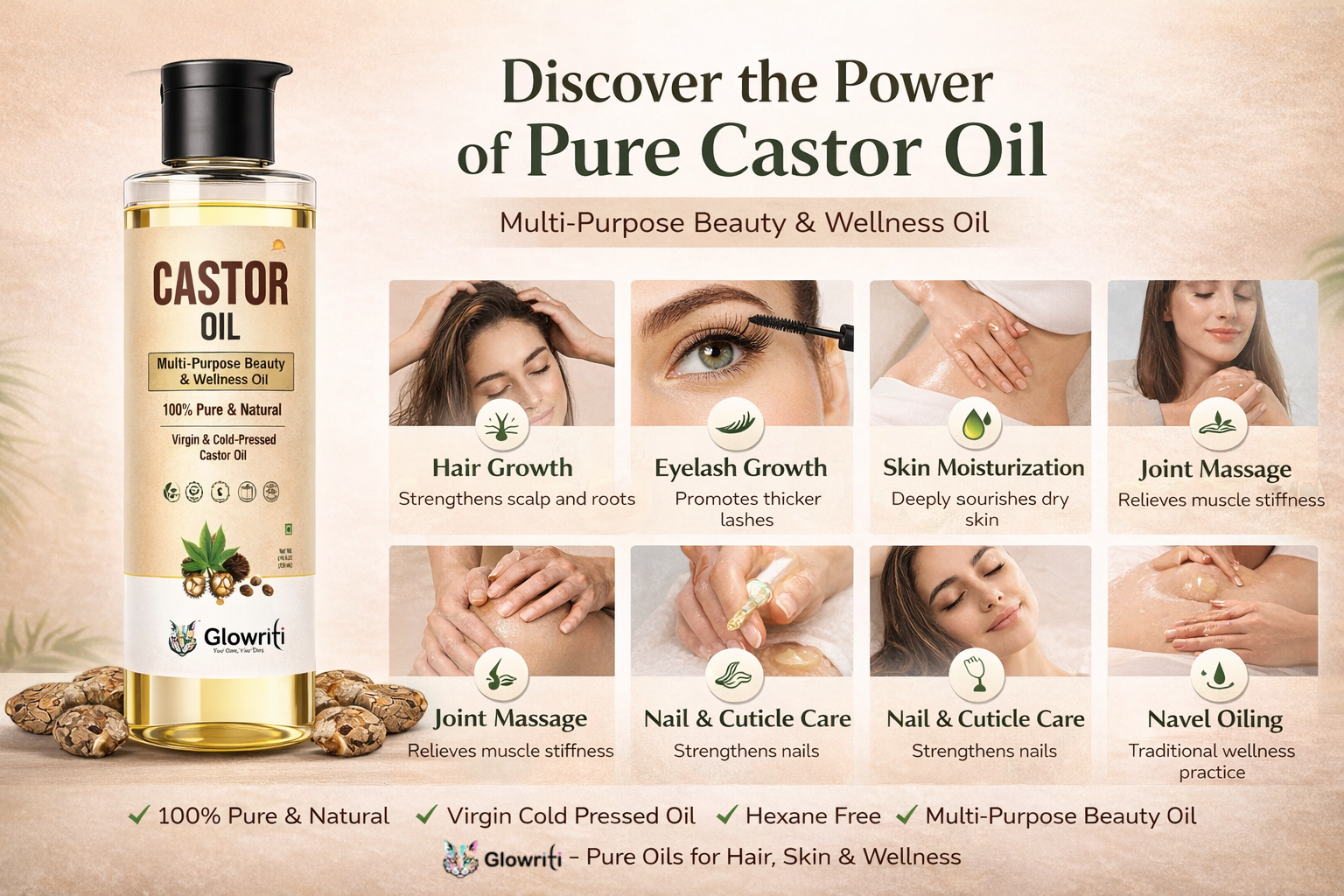 Glowriti Castor Oil is a multipurpose natural oil that can be used for hair care, skincare, nail care, and scalp nourishment. It helps moisturize the skin, strengthen hair, and support healthy hair growth.