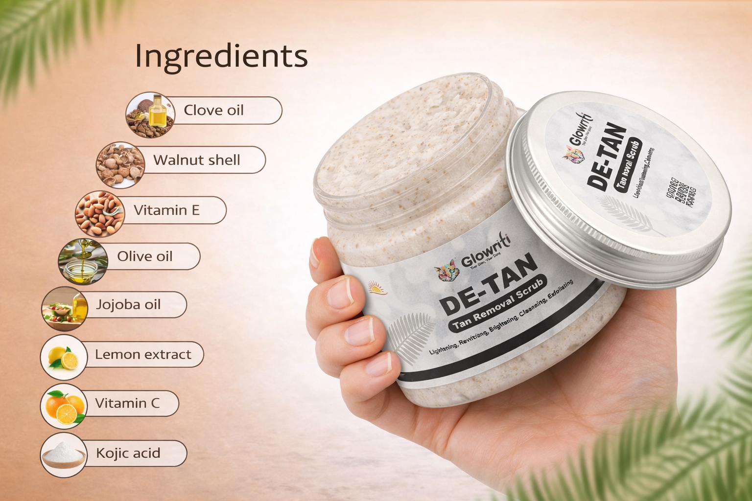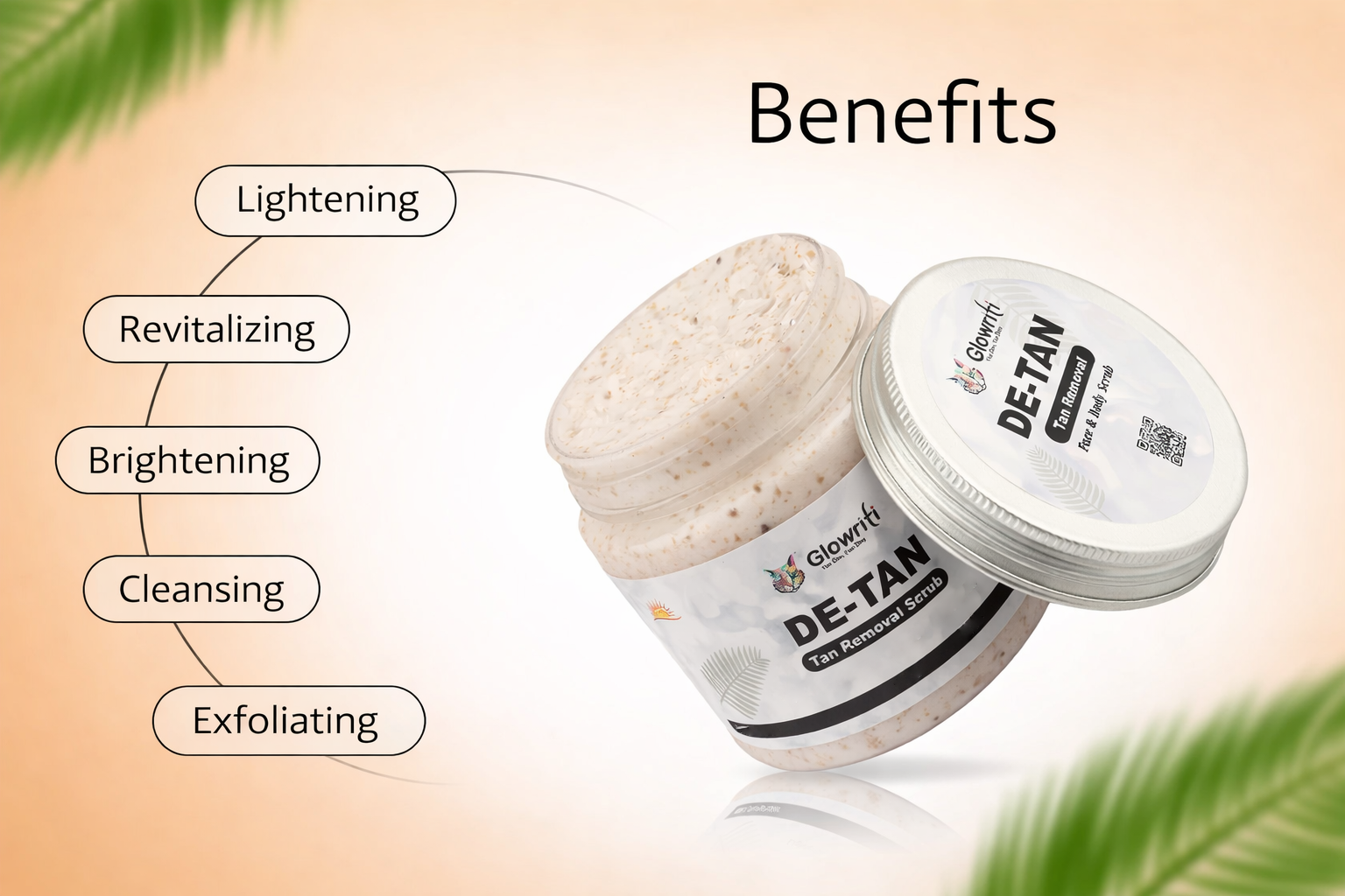 Glowriti De-Tan Scrub helps remove tan, reduce dark spots, exfoliate dead skin, and improve overall skin brightness and texture.