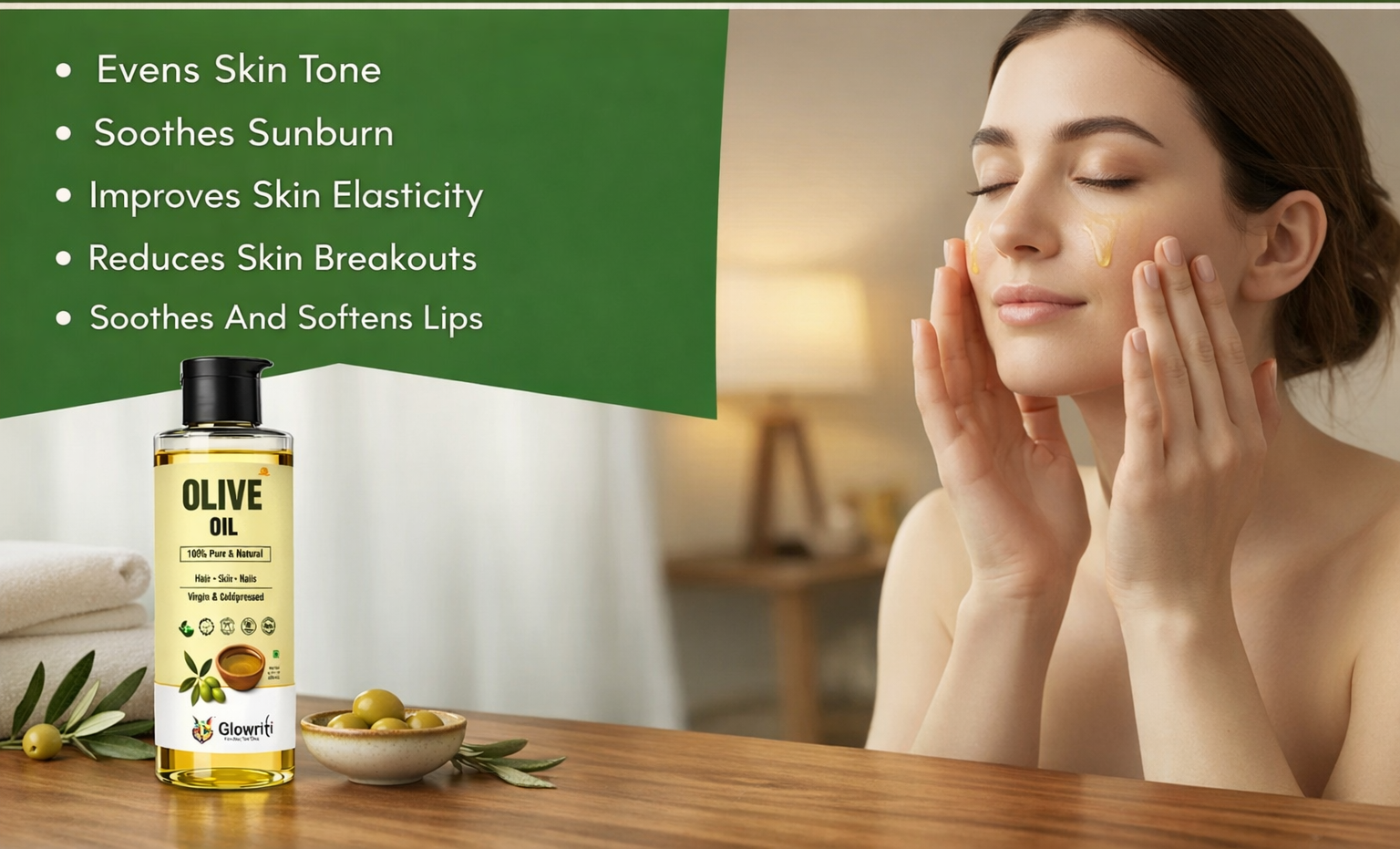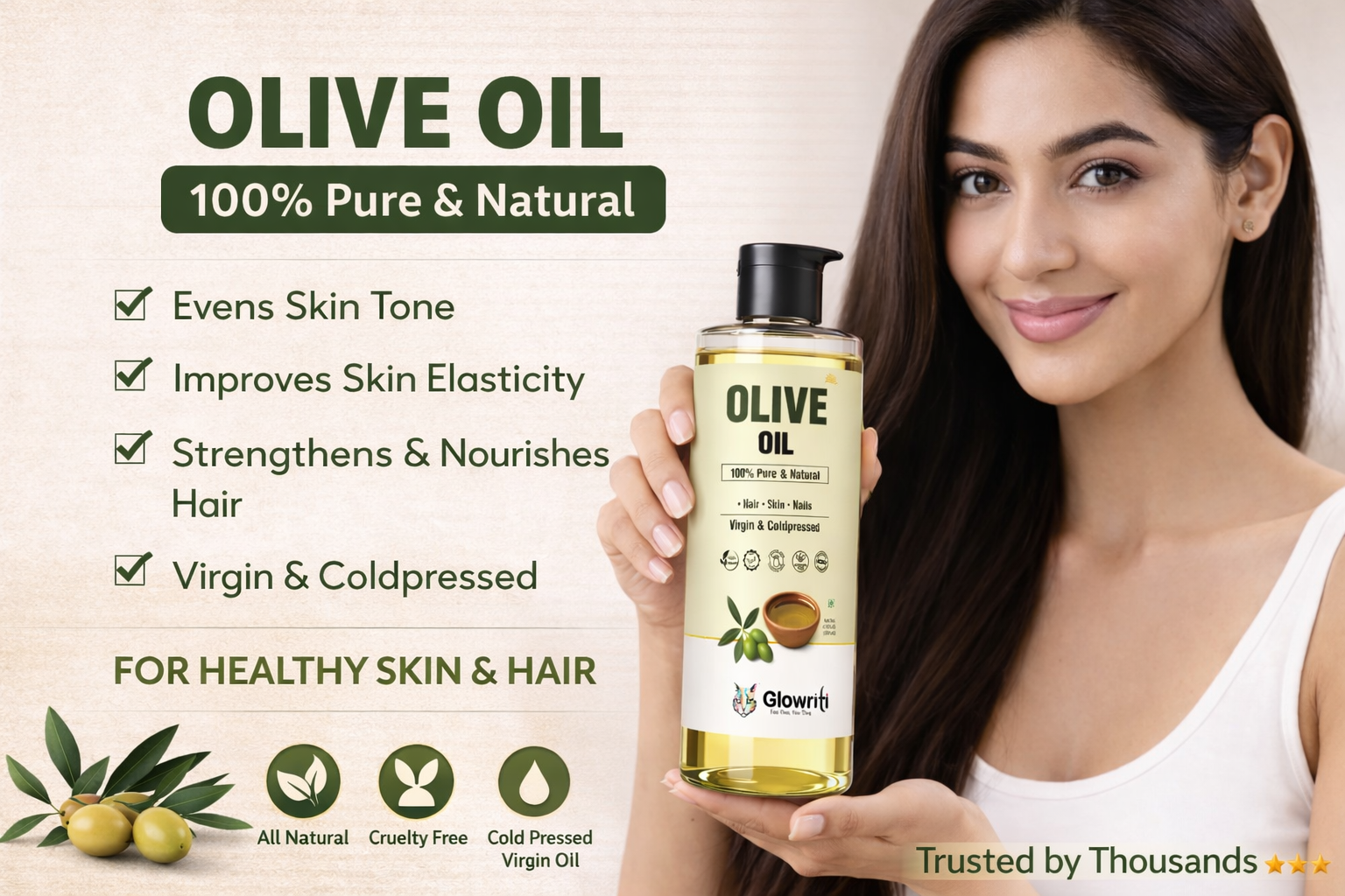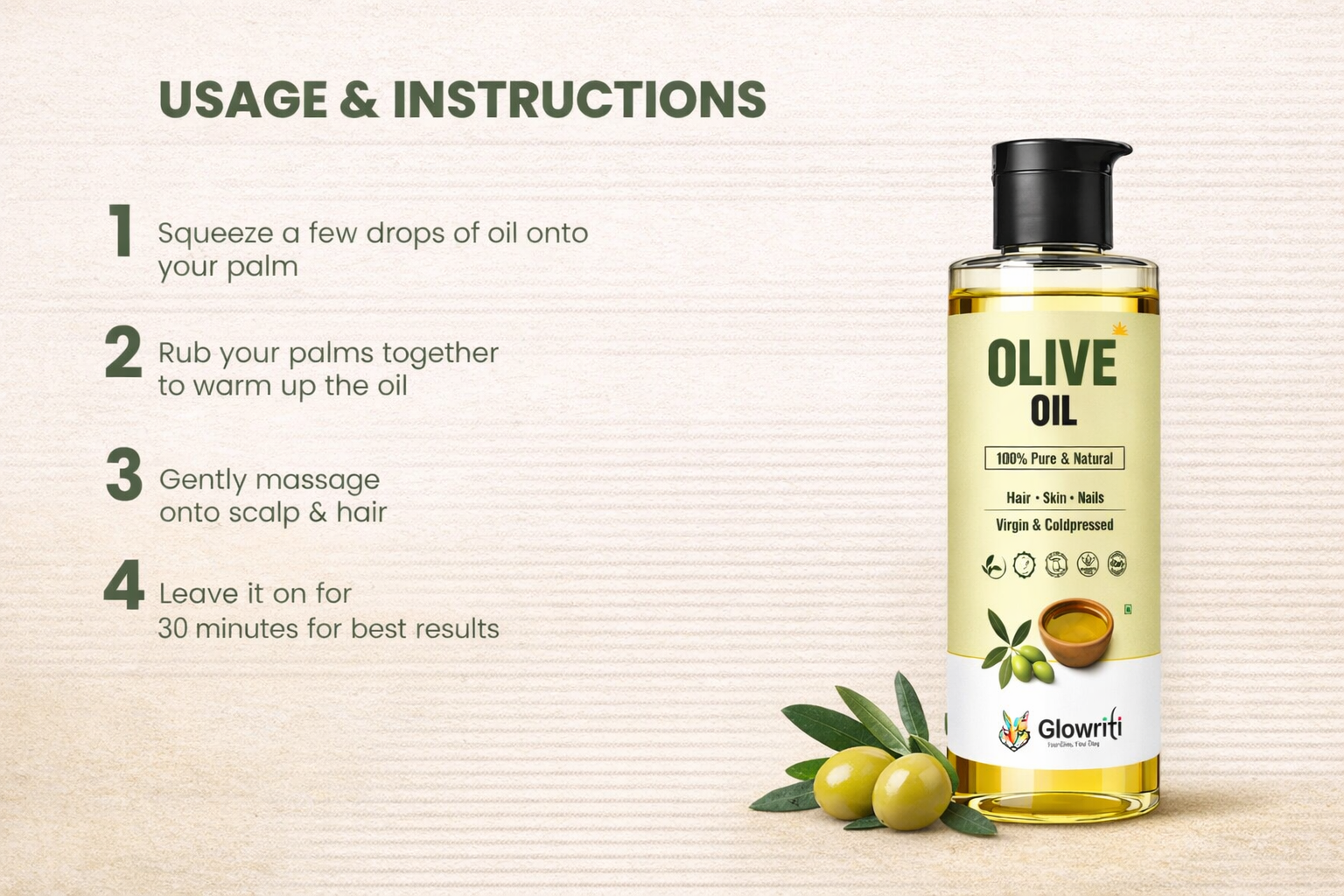 Glowriti Extra Virgin Cold Pressed Olive Oil is a multipurpose oil that can be used for hair care, skincare, body massage, and baby massage. It helps nourish the skin, improve hair texture, and provide deep hydration.