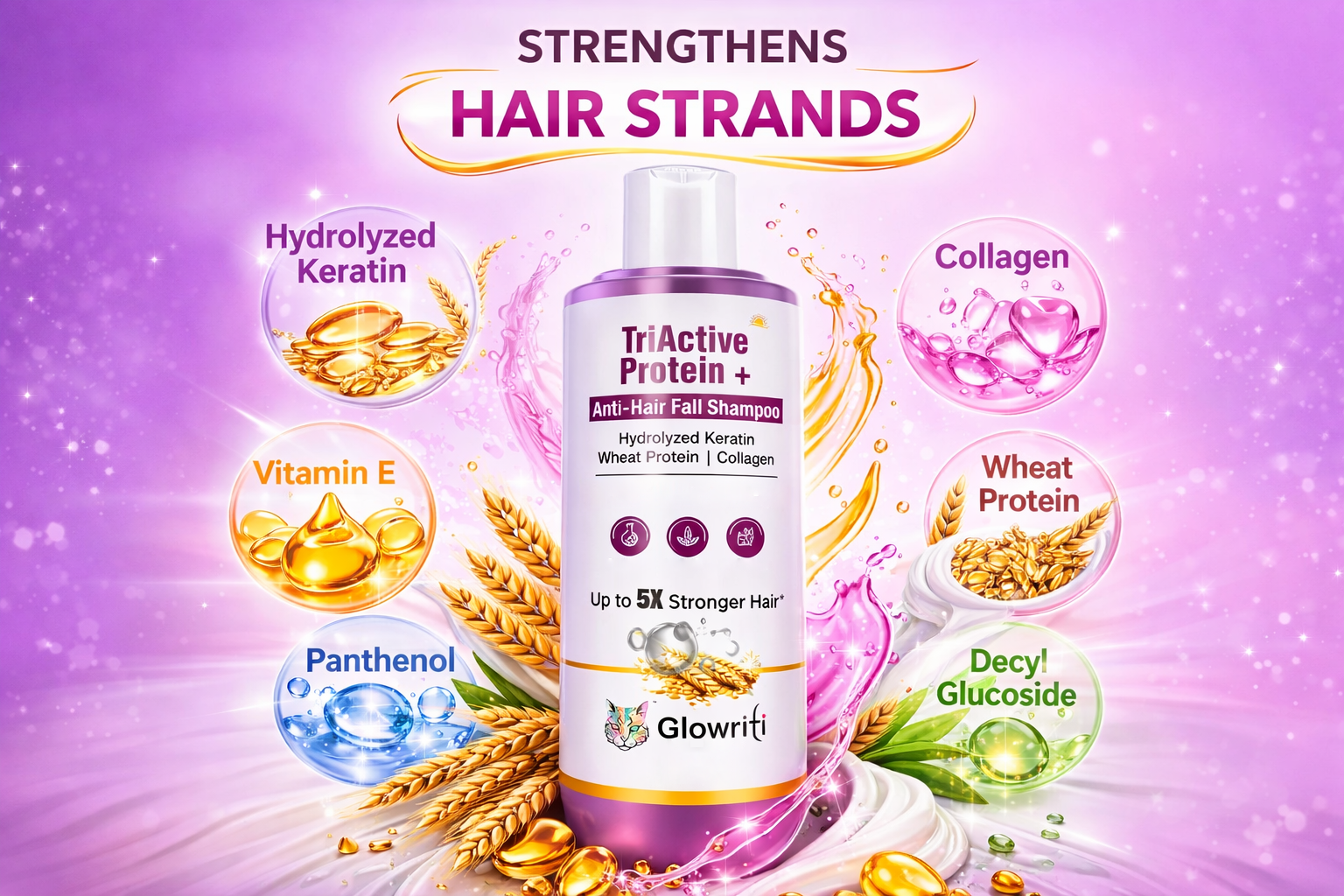 Glowriti TriActive Protein+ Shampoo is an advanced hair strengthening formula designed to help reduce hair fall caused by breakage while improving overall hair health. Enriched with Hydrolyzed Keratin, Wheat Protein, and Collagen, it works to strengthen weak strands and support smoother, healthier-looking hair.